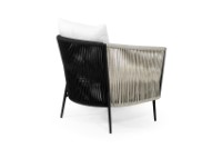 Die Kollektion Isotta zeichnet sich durch ihr dichtes und präzises Flechtwerk aus, das von erfahrenen Handwerksmeistern in Handarbeit gefertigt wird. Dieses umhüllt ein robustes, weiß lackiertes Aluminiumgestell, das an Armlehne und Rückenlehne sichtbar ist. Der Kontrast zwischen der Farbintensität der Kissen und der Eleganz der Materialien macht jedes Stück einzigartig und wiedererkennbar.